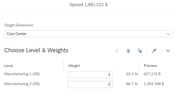 For example, the next image: spread budget across selected cost centers, based on the total cost (driver).